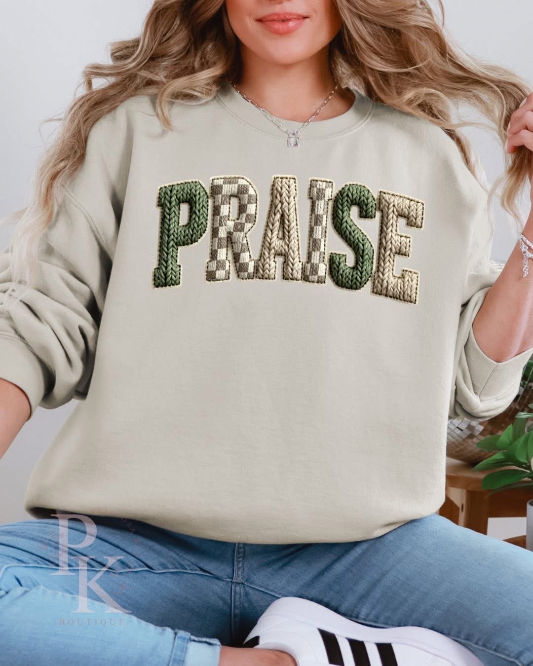 Sand-colored crewneck with sage green & brown faux embroidery Praise design